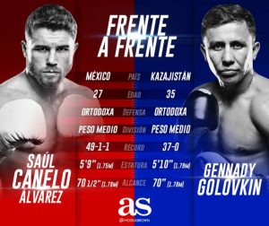El Sábado 15 de Setiembre combatirán por segunda vez , dos de los mejores boxeadores de esta época: Gennady Golovkin contra Saúl » Canelo » Alvarez , por uno de los títulos más preciados en el mundo del Boxeo , el MEDIANO .